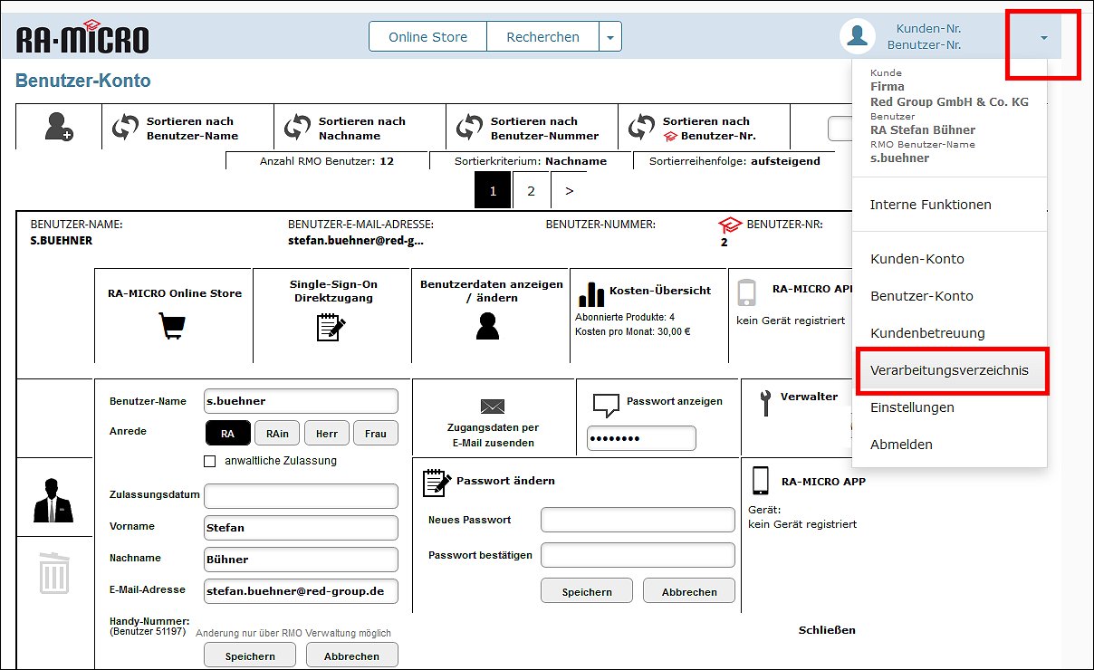 Den Link zum Erstellen des Verarbeitungsverzeichnisses finden Sie im Menü recht oben, neben Ihrer Benutzer- bzw. Kundennummer.